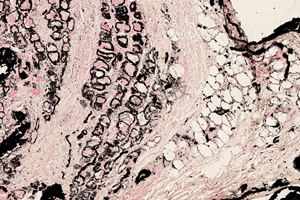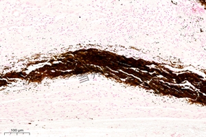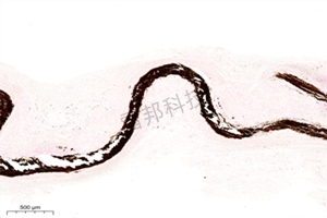 染色利用金属离子置换反应检测组织中钙盐沉积,由硝酸银溶液中的银离子置换组织中沉积的钙离子。